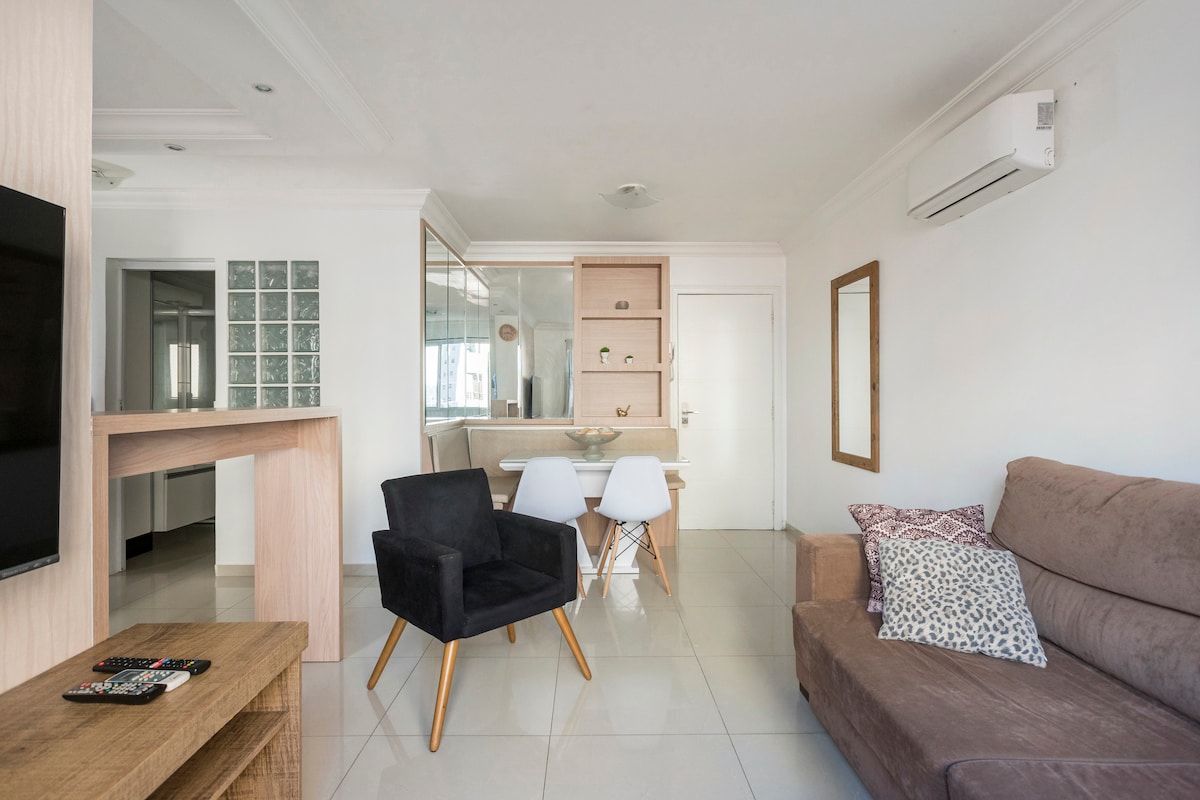 Apartamento Aconchegante com Sacada e Churrasqueira 🌊✨ Nosso apartamento é amplo, arejado e perfeito para quem busca conforto, ele possui: Um quarto com cama box de casal e ar-condicionado e um roupeiro; Sala de estar com TV Smart, Netflix e Wi-Fi, integrada à cozinha completa com todos os utensílios e eletrodomésticos que você precisa; Um banheiro; Uma sacada encantadora com vista panorâmica para a praia, com uma churrasqueira ideal para momentos de lazer.