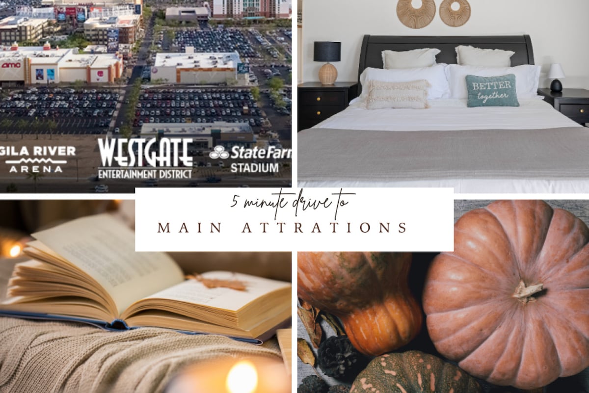 Bem-vindo à Casa Artesanal no deserto. Há uma grande área externa com piscina aquecida, churrasqueira e mesa de fogo de propano. O aquecimento da piscina está incluído no custo da sua estadia de outubro a maio. Você vai gostar de se divertir na cozinha do chef totalmente equipada com eletrodomésticos atualizados e uma fritadeira a ar no forno. As camas confortáveis são de espuma de memória e os banheiros são ambos atualizados. Pule o trânsito do dia do jogo/show e opte por uma caminhada fácil. Estamos localizados a 0,8 milhas do State Farm Stadium.