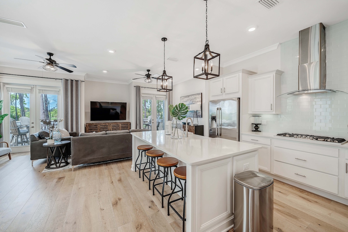 BeachChillin30A acomoda 9 pessoas com móveis modernos, camas king size e uma cozinha gourmet. Passeie com o carrinho de golfe de 6 lugares incluído até Seaside ou vá até o acesso público à praia a poucos minutos de distância, ou ande de bicicleta para viagens panorâmicas a Alys Beach, Rosemary Beach e ao longo da 30A. Relaxe na piscina em estilo resort ou passeie pela rua até o The Big Chill para jantar, fazer compras e eventos ao vivo — perfeito para famílias ou grupos que procuram aventura costeira.