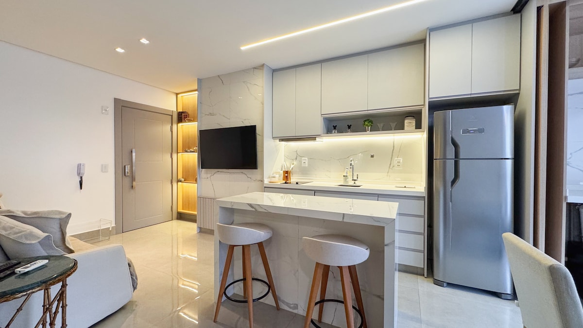 Estúdio moderno no Jardim dos Estados, com vista panorâmica e estrutura completa. Acomoda até 4 pessoas (cama queen + sofá-cama), tem ar-condicionado, Wi-Fi 300mbps, cozinha equipada, duas Smart TVs e garagem coberta privativa. No prédio: piscina aquecida, piscina com borda infinita, sauna seca, academia, coworking, salão de jogos e lavanderia (uso pago). Portaria 24h, elevador panorâmico e muito conforto em uma das melhores localizações da cidade.