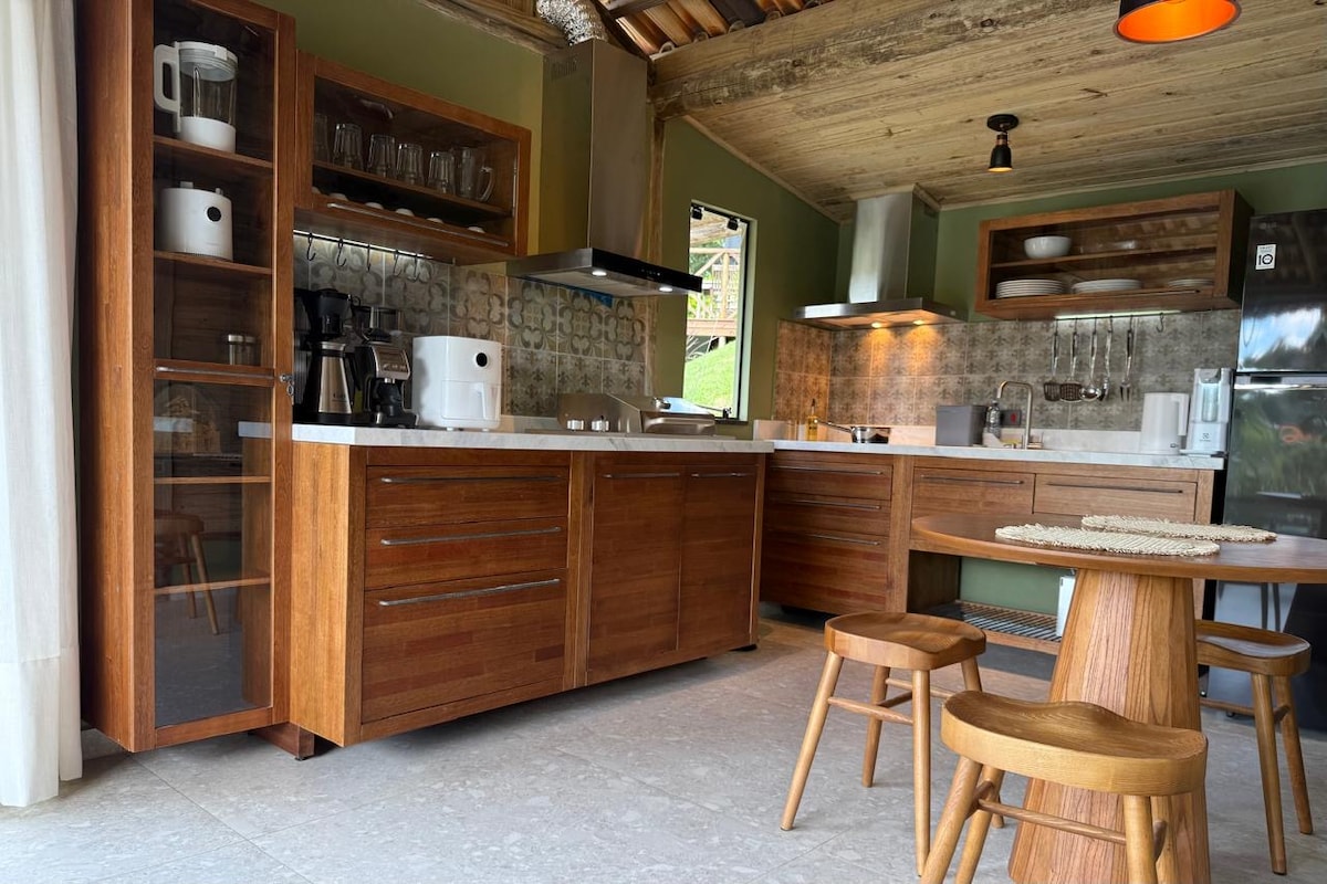 Nossa cabana combina rusticidade e aconchego, criando um ambiente acolhedor para sua estadia. A cozinha está equipada com tudo o que você precisa: cooktop, geladeira, micro-ondas, filtro de água, liquidificador, grill elétrico, cafeteira, além de talheres, pratos e copos. No mezanino, você encontrará uma confortável cama queen, ideal para uma boa noite de sono, além de uma mesa de escritório. A sala conta com um sofá-cama e um calefator que aquece todo o ambiente nos dias mais frios.