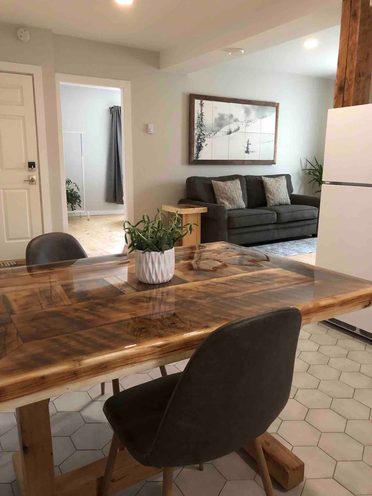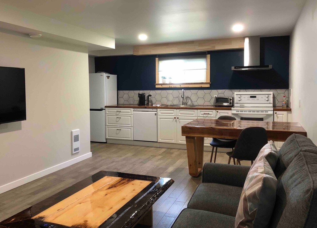 Perfect for the solo traveller or couples looking to get away! This main level suite has a queen size bed, as well as an XL twin sized bed in the bedroom, with exquisite bed linens to satisfy your comfort. You will have a full kitchen, dining and living areas, shared laundry and a full bathroom, including a shower/tub combo. This suite is equipped with a Roku 55" Smart TV, and complimentary WIFI.