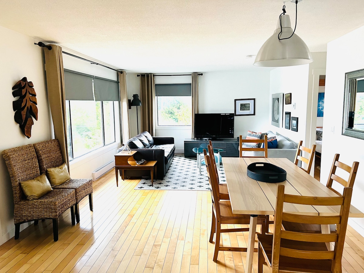 ★ Spray de Urso GRATUITO é fornecido para caminhadas ★ Design deslumbrante e eclético. É aqui que o luxo encontra o contemporâneo, a natureza encontra a vida moderna, a sofisticação encontra a simplicidade. Comodidades: piscina coberta, banheira de hidromassagem, escorregador infantil, academia Delicie-se com o conforto e a tranquilidade do nosso condomínio. Com uma sala de estar recém-projetada, 2BR com camas king e queen size. Dois banheiros completos. Cozinha totalmente equipada. Pátio. Ar condicionado, Wi-Fi, TV a cabo, TVs 4K.