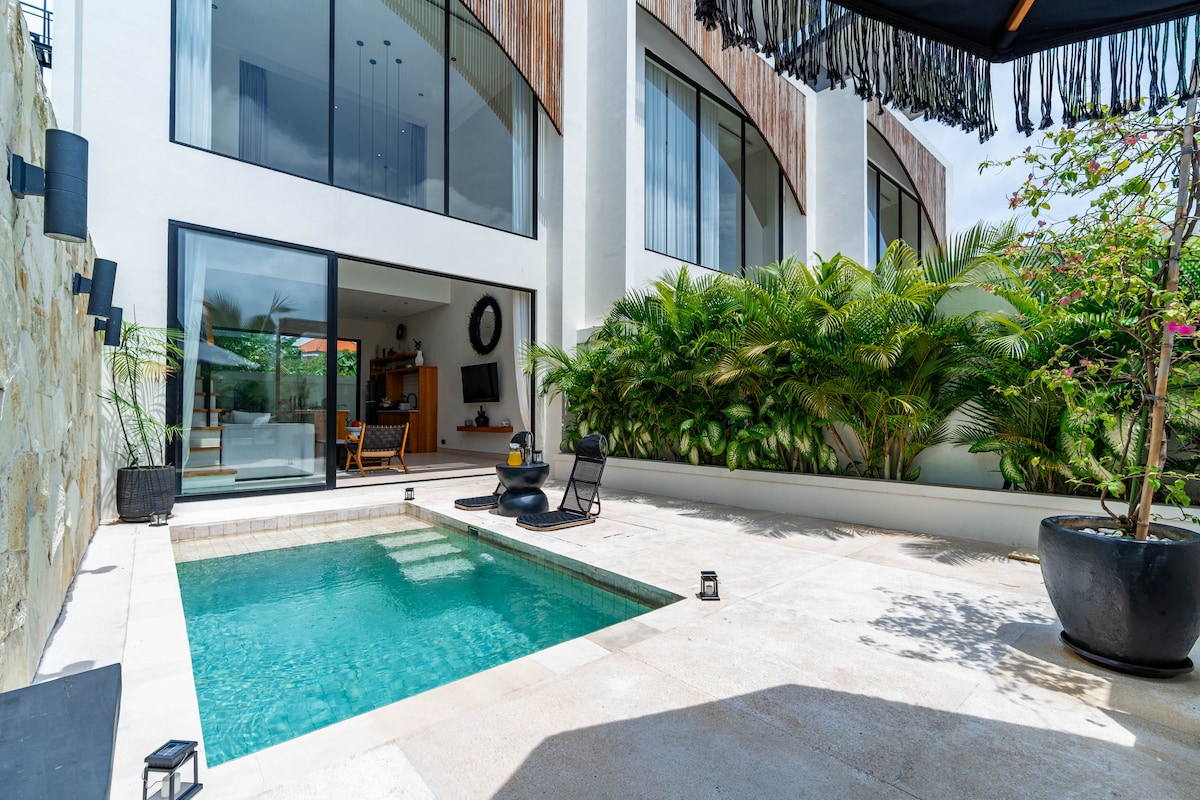 3-bedroom Jungle view villa situated just 2 minutes from the ocean, nestled in the vibrant heart of Canggu. Modern, spacious and clean. These villas are conveniently close to a variety of supermarkets, top-rated restaurants, gyms, and the exquisite surf spot of Canggu. Offering the best location in Canggu, perfectly positioned between Batu Bolong and Berawa. - Spacious, sunken living room - Private pool and garden - Bathtub - High-speed Wi-Fi - Rooftop with ocean view