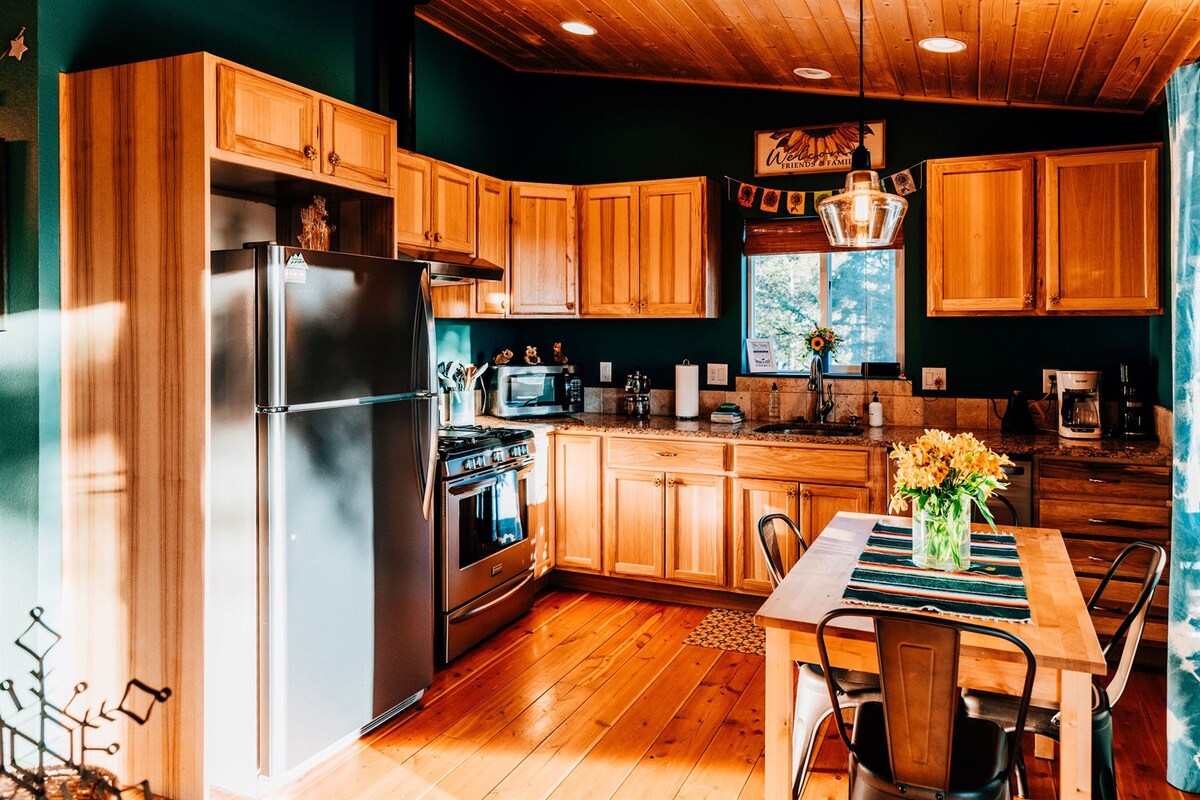 ★ King bed ★ Dog inclusive ★ 3 private acres + Pikes Peak views ★ Hot tub ★ Wood stove with firewood and fire-starting supplies provided ★ 1.25 hours to CO Springs, 2.25 hours to DIA Perched atop a rock wall, Sunflower Cabin is surrounded by pine and aspen trees. The views of Pikes Peak are unmatched, especially at sunrise and sunset! You will likely see more deer, turkeys, and chipmunks than other humans, but if you’d like to venture out, the town of Florissant is just 23 minutes away!