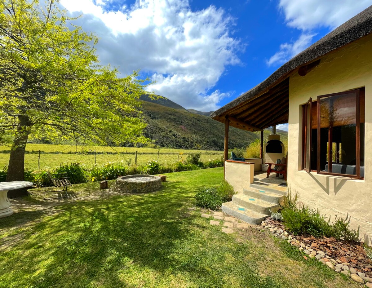 Venha e fique em nossa bela e única Rondavel de palha privada - perfeita para um casal ou família de 2 adultos e 2/3 crianças. Céu auto-suficiente em um vale escondido. Cama king no quarto principal e espaço de loft divertido para as crianças com 1 cama de casal e 1 cama de solteiro. Passeie com área de braai e fogueira. Aceita animais de estimação também. Relaxe no luxo sob a Via Láctea, ao canto dos sapos, em sua própria banheira de hidromassagem a lenha, com vista para campos e montanhas. Espaço sem fim para passear e explorar a natureza.
