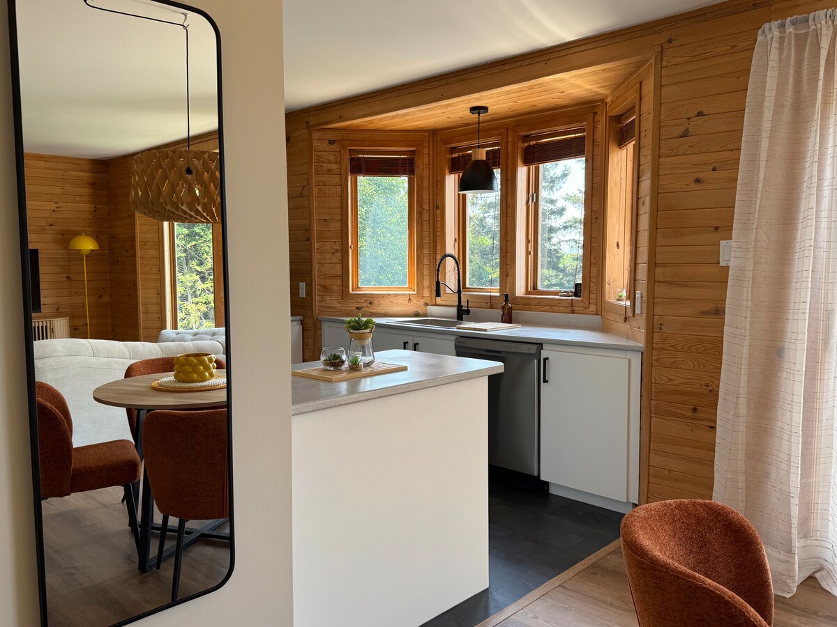 Pequeno chalé escandinavo para duas pessoas idealmente localizado para desfrutar das atrações de Charlevoix. Tem um circuito termas (banheira de hidromassagem, sauna, hammam) Muito intimista e no meio da floresta, a vista tem vista para o rio majestoso e as montanhas ao longe. Todo o equipamento moderno está lá e o conforto é absoluto, com ar condicionado e lareira ao ar livre. O design de conceito aberto foi projetado para uma experiência imersiva na natureza: grandes janelas, chuveiro panorâmico. Acesso através de uma estrada privativa a 500 m.