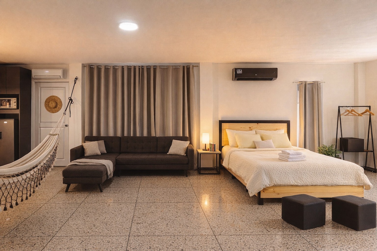 Alojamento equipado para lhe oferecer tudo o que você precisa em um único local 24 horas por dia, 7 dias por semana, cumprindo os protocolos de limpeza avançada, conforto e paz em um local acolhedor com todas as comodidades necessárias para que sua estadia seja agradável. Equipamos a acomodação com Wi-Fi, os 2 quartos com ar-condicionado, escritório com mesa e cadeira, grades e câmeras de segurança com vigilância 24 horas por dia, uma vaga de estacionamento, cozinha abastecida e muito mais.