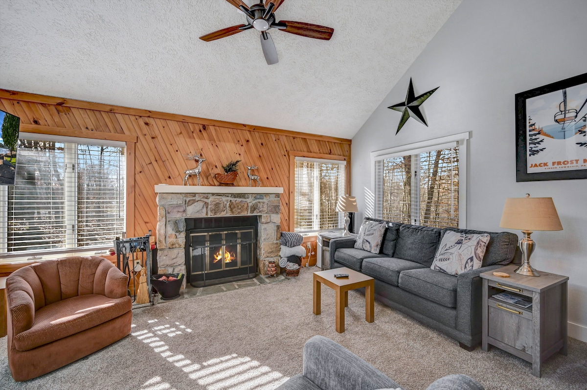 Venha relaxar neste aconchegante retiro de 3 quartos e 3 banheiros perfeitamente localizado na Montanha Jack Frost! Esquie diretamente da trilha ao lado da casa que se conecta ao Ridge Run - para que você possa começar e terminar seu dia nas pistas sem nunca entrar no carro. Depois de um dia cheio de diversão ao ar livre, relaxe junto à lareira ou mergulhe na banheira de hidromassagem privativa. Desfrute de uma escapadela de golfe de fim de semana no Golf Club nas proximidades. Big Boulder e Lake Harmony estão a apenas 20 minutos de distância, oferecendo oportunidades para esquiar, jantar e diversão à beira do lago durante todo o ano.
