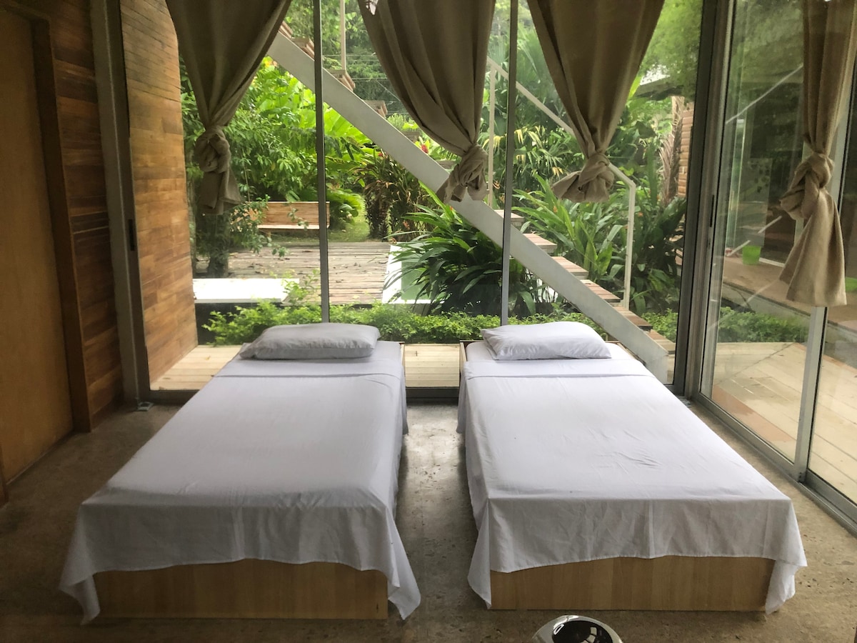 Bem-vindo à La Esquina Verde, uma casa minimalista na selva perto do Parque Nacional de Cahuita. Este quarto no térreo tem duas camas de solteiro, um banheiro privativo e portas de vidro do chão ao teto em três lados, com uma bela vista para a floresta. Entre no seu terraço privativo com acesso direto à piscina e desfrute dos sons da vida selvagem — macacos, pássaros, sapos e muito mais. O café da manhã está incluído, e seu anfitrião, Rodolfo, mora no local e terá prazer em compartilhar seu conhecimento sobre a região.