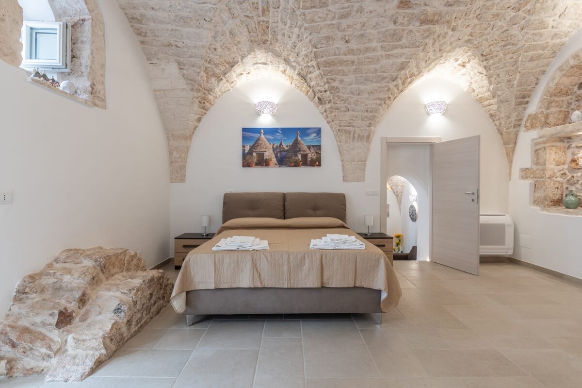 Este espaço único, esculpido dentro de trulli tradicionais, tem seu próprio charme e permite que você experimente o verdadeiro espírito do Vale de Itria. Você entra por uma velha pérgula de morango e uva. A cozinha e o banheiro estão situados nas alcovas, enquanto as áreas de jantar e de dormir estão localizadas em um trullo sarraceno e um trullo de cone alto. O pátio privativo e a piscina de borda infinita nas proximidades oferecem vistas para o vale e para o horizonte de Ceglie Messapica.