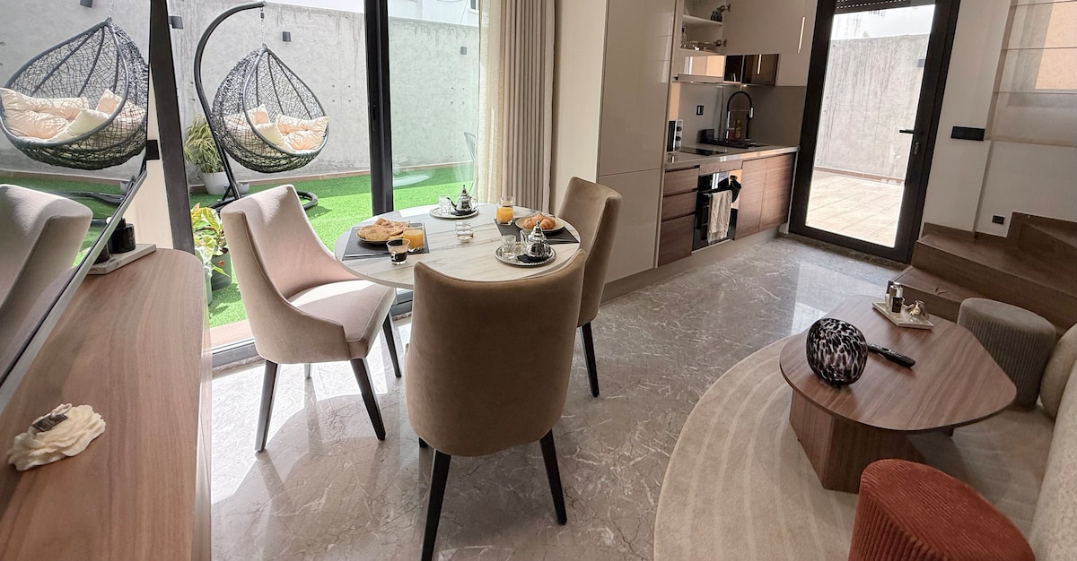 Butterfly 703🦋, um refúgio de paz onde a elegância de uma residência moderna se mistura com os confortos de hotéis de 5* no coração de Casablanca! Relaxe em uma espaçosa sala de estar com um design moderno, equipada com uma Smart TV de 55’com Netflix e IPTV para noites de relaxamento absolutas. O quarto, um verdadeiro ninho aconchegante, promete noites tranquilas e restauradoras ☁️ Da sua varanda privada, observe o esplêndido pôr do sol sobre a cidade, tornando cada momento da sua estadia inesquecível! ✨