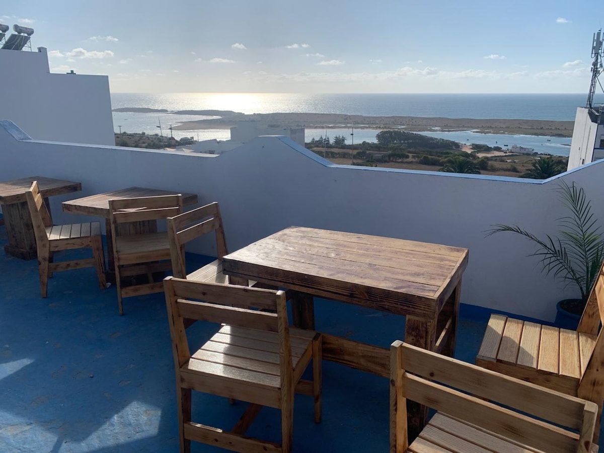 Oferecemos no andar de cima da casa Simonetta a possibilidade de alugar parte da propriedade. Este último consiste em uma vista deslumbrante da lagoa de Oualidia, com dois quartos. Ideal para uma escapadela com amigos e familiares.