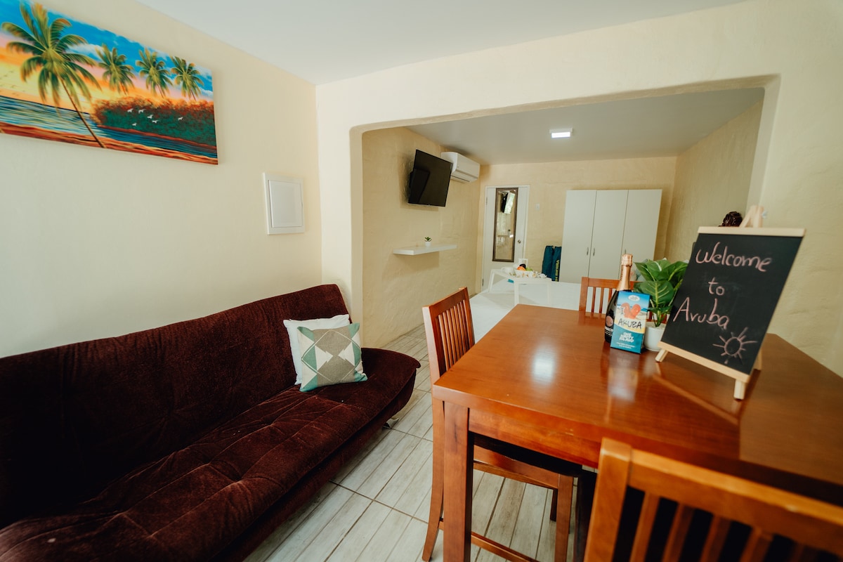 Estúdio moderno construído em novembro de 2022, localizado no coração de Aruba, perto de supermercados, farmácias e lojas locais. Moramos ao lado e ficaremos felizes em ajudar com o que precisar, incluindo táxis ou aluguel de carro diretamente conosco. Como o transporte público é limitado, recomendamos alugar um carro para explorar a ilha. Limpo, aconchegante e totalmente equipado — perfeito para a sua estadia em Aruba!