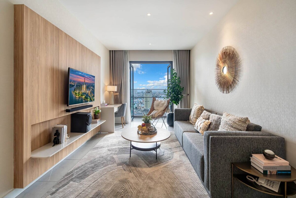 O apartamento é lindamente projetado em estilo Wabi Sabi, localizado no andar alto do edifício ZENITY CAPITALAND no coração do Distrito 1. Com um estilo artístico único, o apartamento oferece instalações de resort de alta classe, incluindo piscina, banheira de hidromassagem, academia, sala de reuniões, sala de trabalho privativa, área de churrasco no jardim, área de lazer infantil, espaçoso salão com ar condicionado e Wi-Fi no saguão. Todas as janelas do quarto e varanda têm vista panorâmica de toda a cidade. É um apartamento único, luxuoso e elegante
