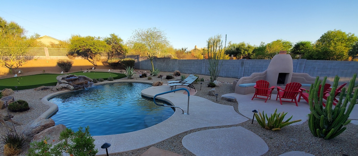 A casa 4BD 2BA está lindamente decorada para quem entra na área de Scottsdale/Cave Creek. O quintal é perfeito para relaxar com a grande piscina aquecida, 5 buracos em verde, lareira, TV de tela grande e churrasqueira embutida com 3 áreas de estar diferentes para jantar ou relaxar ao ar livre. No interior, você encontrará uma cozinha luxuosa com tudo o que você precisa, móveis confortáveis, mais de 250 canais de TV, internet/Wi-Fi de alta velocidade, um bar, bancadas de granito e muito espaço para toda a família. Relaxe no seu melhor!
