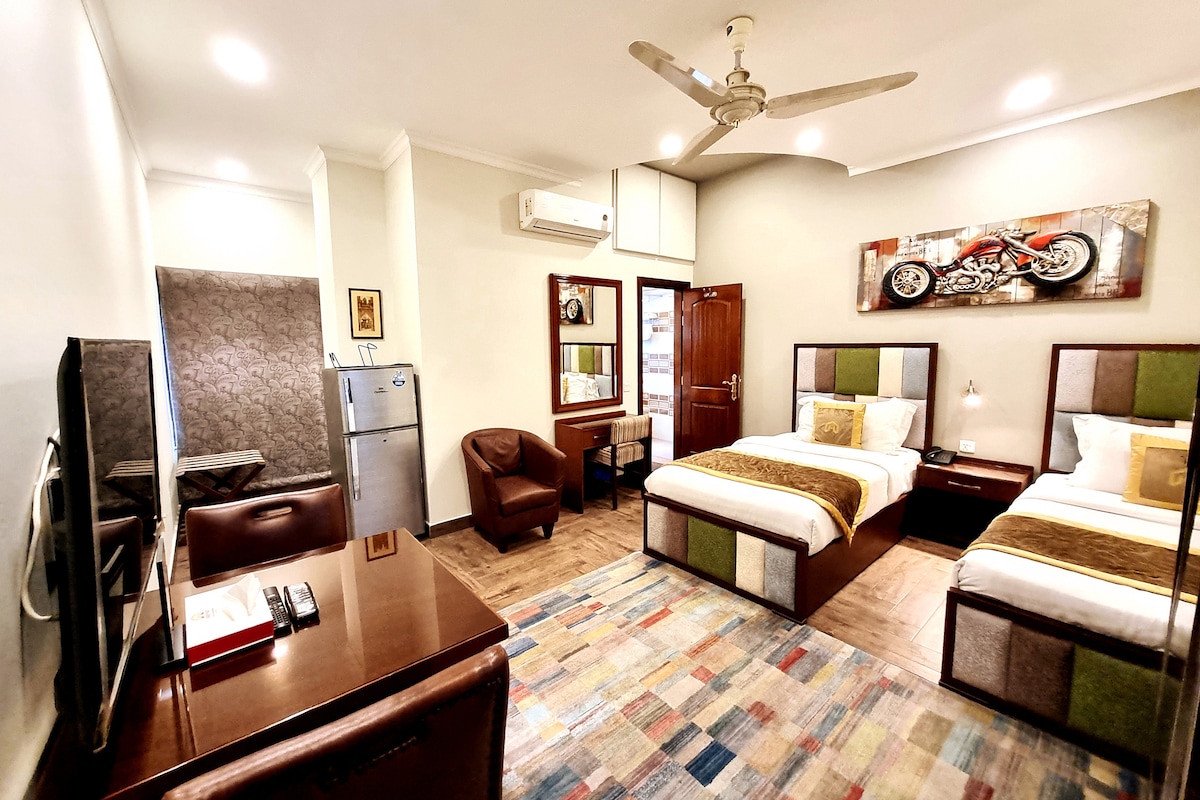 RUA ESTRITA PARA FAMÍLIAS, LIVRES E CASAIS Situado no coração de Lahore, o Hayyat Luxury Hotel Apartments é um refúgio de conforto e luxo. Nosso apartamento possui uma espaçosa área de estar completa com uma smart TV e área de jantar. Nossa cozinha totalmente equipada oferece todas as conveniências de uma casa, incluindo forno, micro-ondas, torradeira e chaleira. Delicie-se com um banho relaxante no banheiro privativo, completo com produtos de higiene pessoal gratuitos.