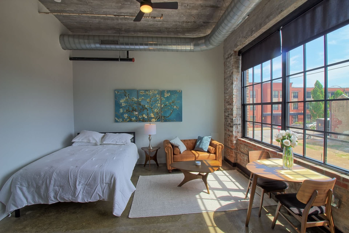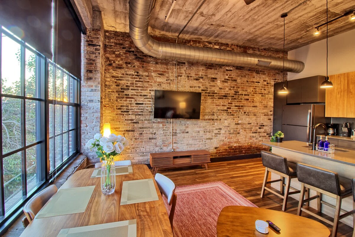 O Nash Loft é um estúdio minimalista deslumbrante com tetos de 3,65 metros, uma cozinha totalmente equipada com eletrodomésticos pretos inoxidáveis e bancadas de quartzo, um espaçoso closet, uma lavadora + secadora empilháveis, um banheiro de designer com acessórios pretos inoxidáveis e chuveiro de vidro sem moldura e janelas industriais de aço de 2,13 metros com vista para a rua arborizada e lojas abaixo. Situado ao longo da famosa Locust Street, no coração de Midtown, você estará a poucos passos da SLU, Wells Fargo, BJC e The Grove.