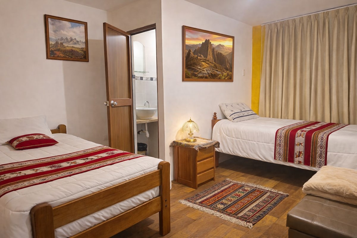 Um grupo de até cinco pessoas se sentirá confortável neste apartamento independente no segundo andar da nossa casa, localizado em um bairro seguro da cidade, a 25' a pé e uma unidade de táxi de 8' para o centro histórico da cidade. Três quartos iluminados e um lounge com kitchenette bem equipada permitem que você organize sua estadia em Cusco como quiser. Kitchenette e o novo banheiro contam com água quente 24h.