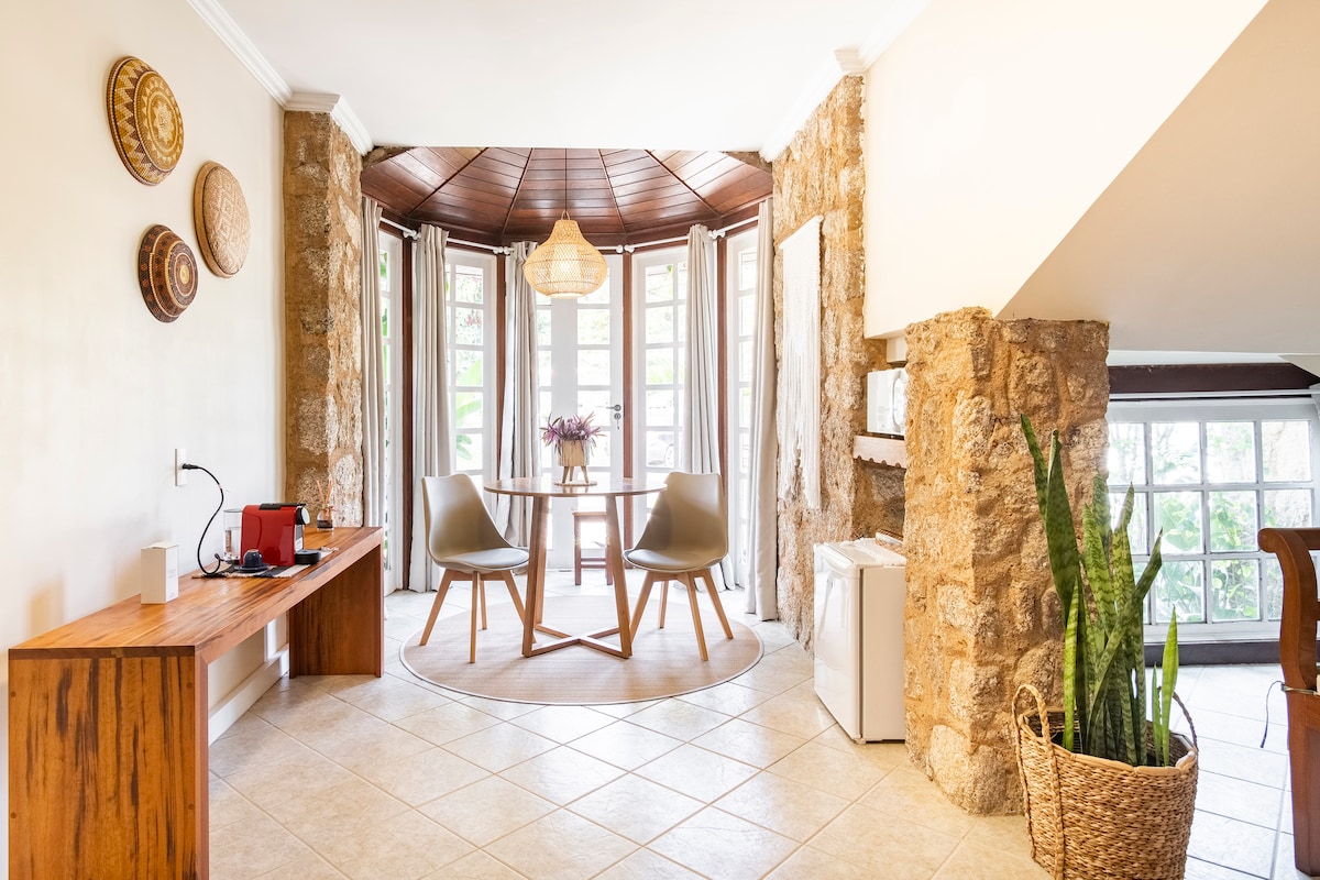 Passe dias em Paraty na casa onde grande ator brasileiro Paulo Autran recebia seus amigos mais íntimos. Essa é a suíte Vila Gabriela. Você terá a disposição uma suíte com quarto anexo e jardim de inverno ao ar livre entre eles. Cada quarto tem uma cama de casal e roupa de cama e banho da melhor qualidade. O café da manhã típico incluso é um caso à parte. Está incluso também água mineral, cervejinha e cachaça local. Serviço de concierge, wifi, roupão, ar condicionado e artigos de toilet veganos