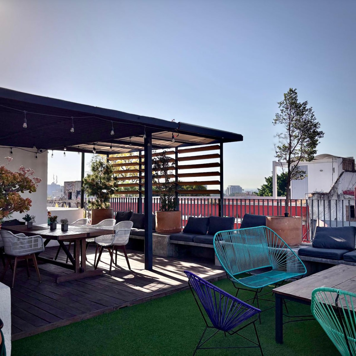 No Nube Mia Hostel oferecemos um espaço seguro, limpo e acolhedor, em frente ao parque Rojo, no coração de Guadalajara. O albergue foi bem pensado para que nossos hóspedes gostem de estar ou trabalhar em seu espaço; fornecemos serviço de limpeza diário e wi-fi em toda a propriedade. Os hóspedes têm acesso a um belo terraço com vista para a cidade e uma sala de estar com TV, sala de jantar e cozinha equipada para uso comum.