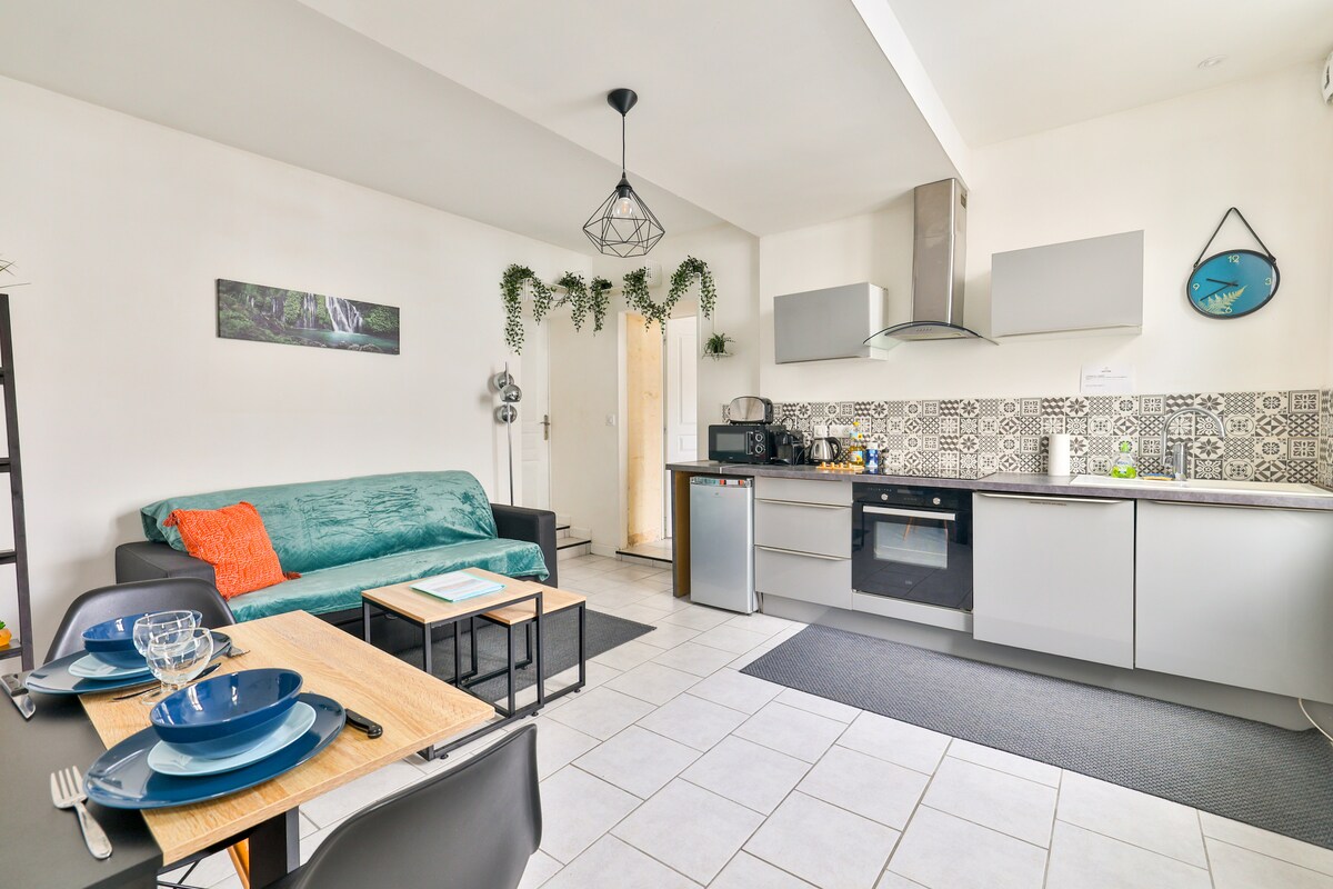 Novo ! Bem-vindo ao "Le petit Alambic", habitação de Jenny e Jonathan no coração de Cognac. Oferecemos uma nova acomodação para até 4 pessoas graças a um sofá-cama "real" 180 x 200cm na sala. E, 1 quarto com uma cama de casal no mezanino fechado. Sugerimos que você fique nesta acomodação mobiliada recém-renovada com materiais de qualidade. O alojamento é adjacente à nossa casa com uma entrada independente.