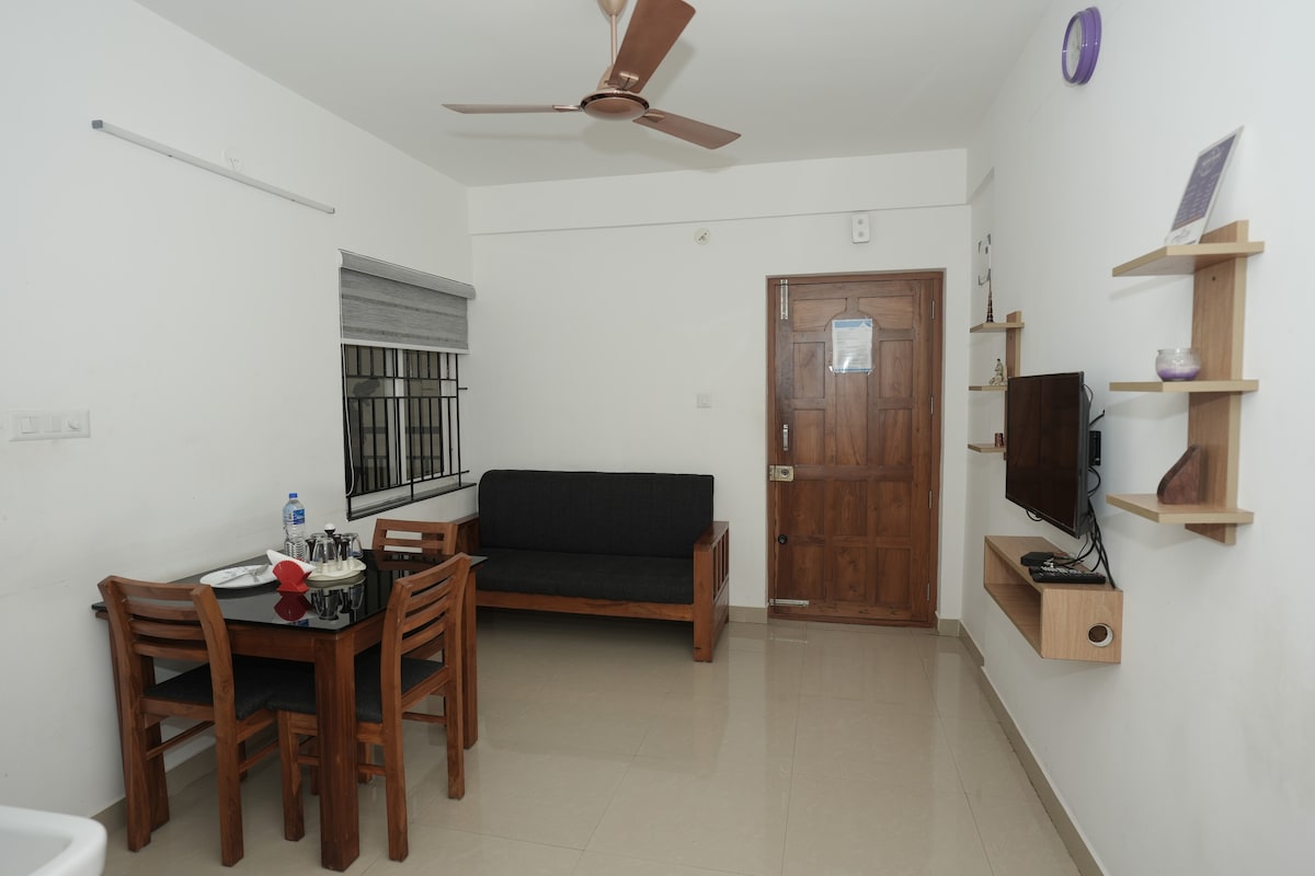 Traga toda a família para este ótimo lugar. 2 BHK espaçoso e bem ventilado, voltado para o leste, apartamento mobiliado com ar condicionado em ambos os quartos, banheiro anexo com Geyser, televisão, geladeira, água RO, chaleira elétrica, máquina de lavar, Wi-Fi e cozinha modular com fogão a gás com utensílios. Guruvayoor Sree Krishna & Mammiyur Siva Temple fica a apenas 200 m do apartamento. Bons restaurantes vegetarianos e supermercados estão disponíveis perto do apartamento. A estação ferroviária fica a apenas 800 metros.