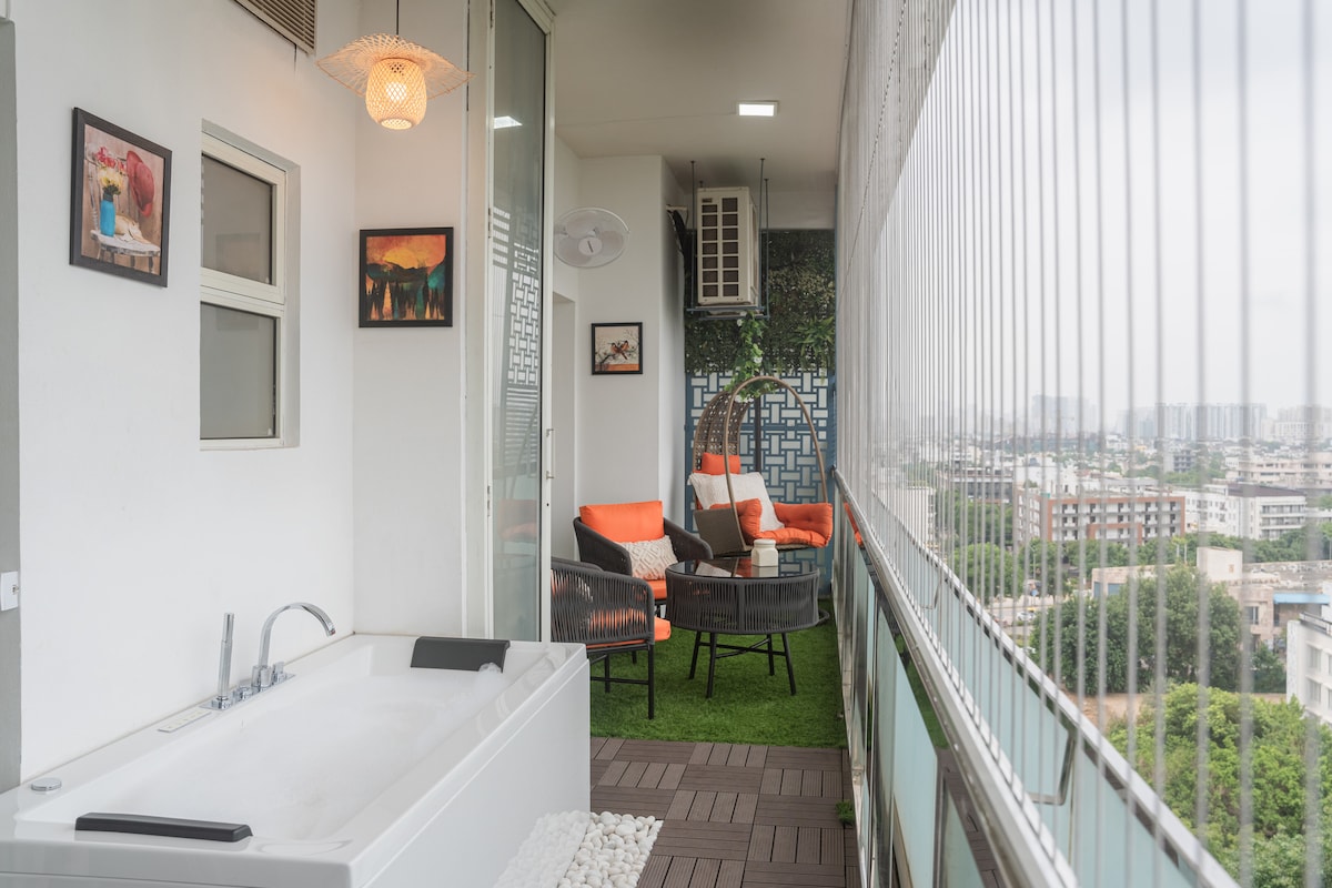 Luxe Heaven Heights 12th Patio 2 stands out with its private 2-seater jacuzzi, stunning high-rise city views, and modern architecture. The big wall mirror adds elegance, while the spa-like bathroom ensures luxury. Guests enjoy a pool, gym, high-speed WiFi, big-screen TV, and 24x7 security & parking. The fully equipped kitchen makes home-cooked meals easy. Located in Gurgaon’s prime area, it’s super safe for women and offers exclusive private access!