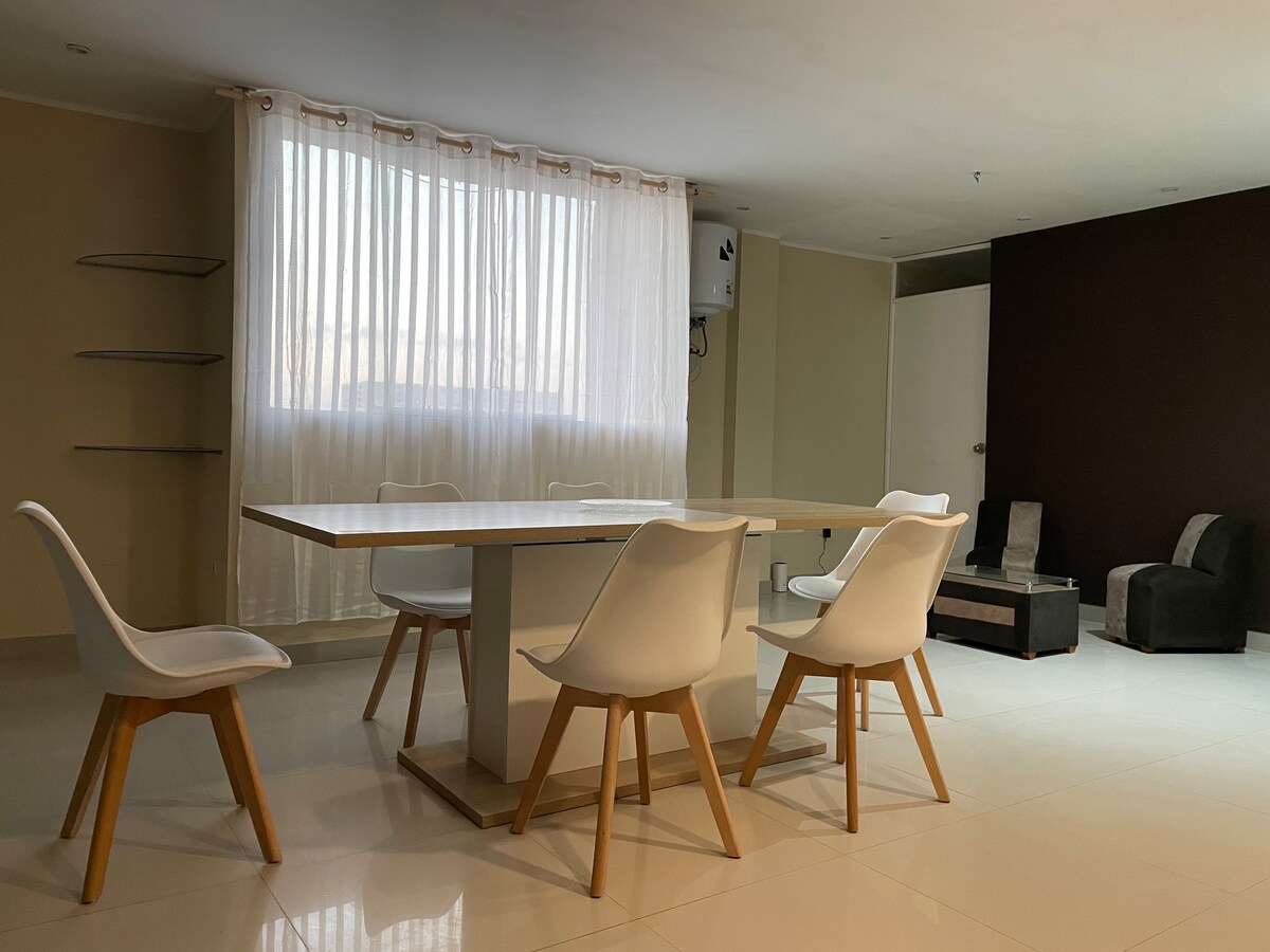 Welcome to your peaceful home in Chiclayo! This stylish first-floor apartment is quiet and secure. Enjoy filtered water, fast internet, smart tv w/ local channels and Netflix, hot showers, A/C, and modern extras like a dishwasher, clothes washer, dryer, and microwave. The building has 24/7 guarded access, and there are no stairs to climb — perfect for families, seniors, or anyone who values comfort and convenience. You’ll feel relaxed, safe, and right at home from the moment you arrive.