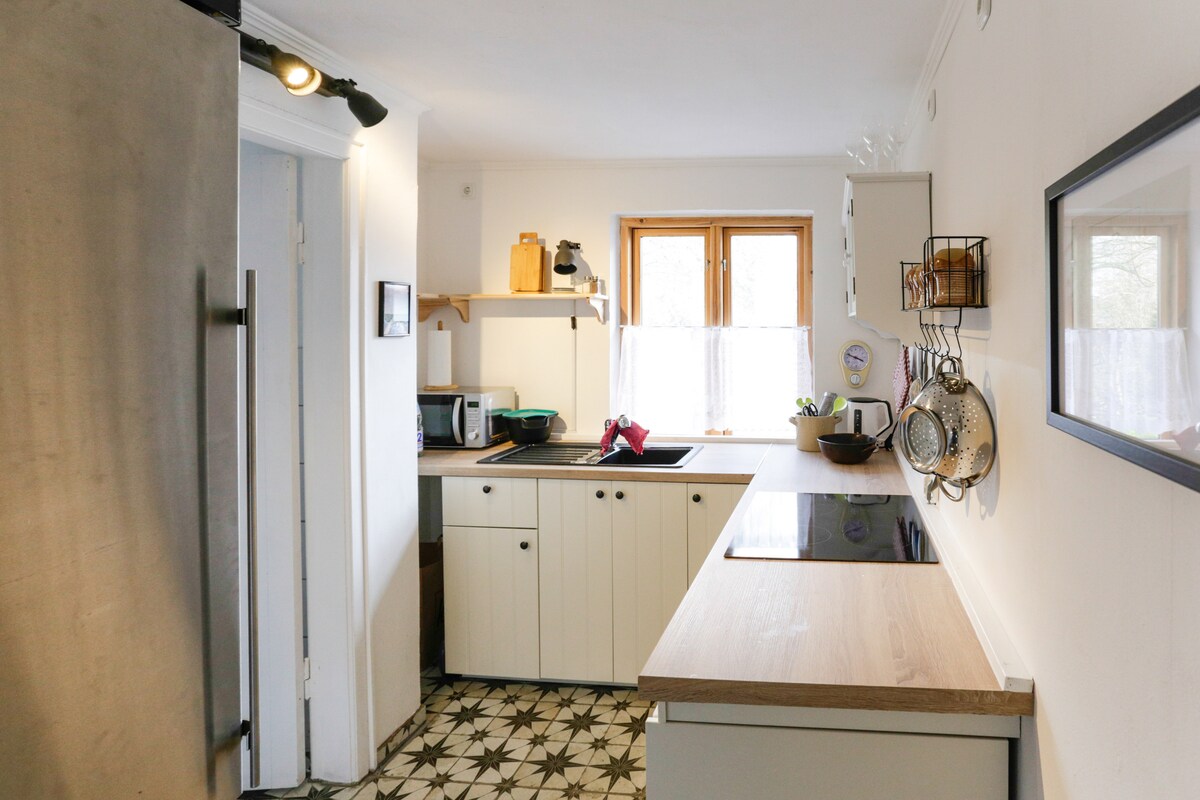 Este apartamento é a antiga sala de aula de uma escola com mais de 100 anos. Ele foi completamente renovado e preservou o charme de tempos passados. O apartamento é amoroso e confortável para viajantes individuais, casais, famílias e também amantes de cães. Localização tranquila, com vista para o jardim e estacionamento privativo gratuito. O apartamento é no térreo, com um quarto e um sofá-cama confortável na sala de estar.