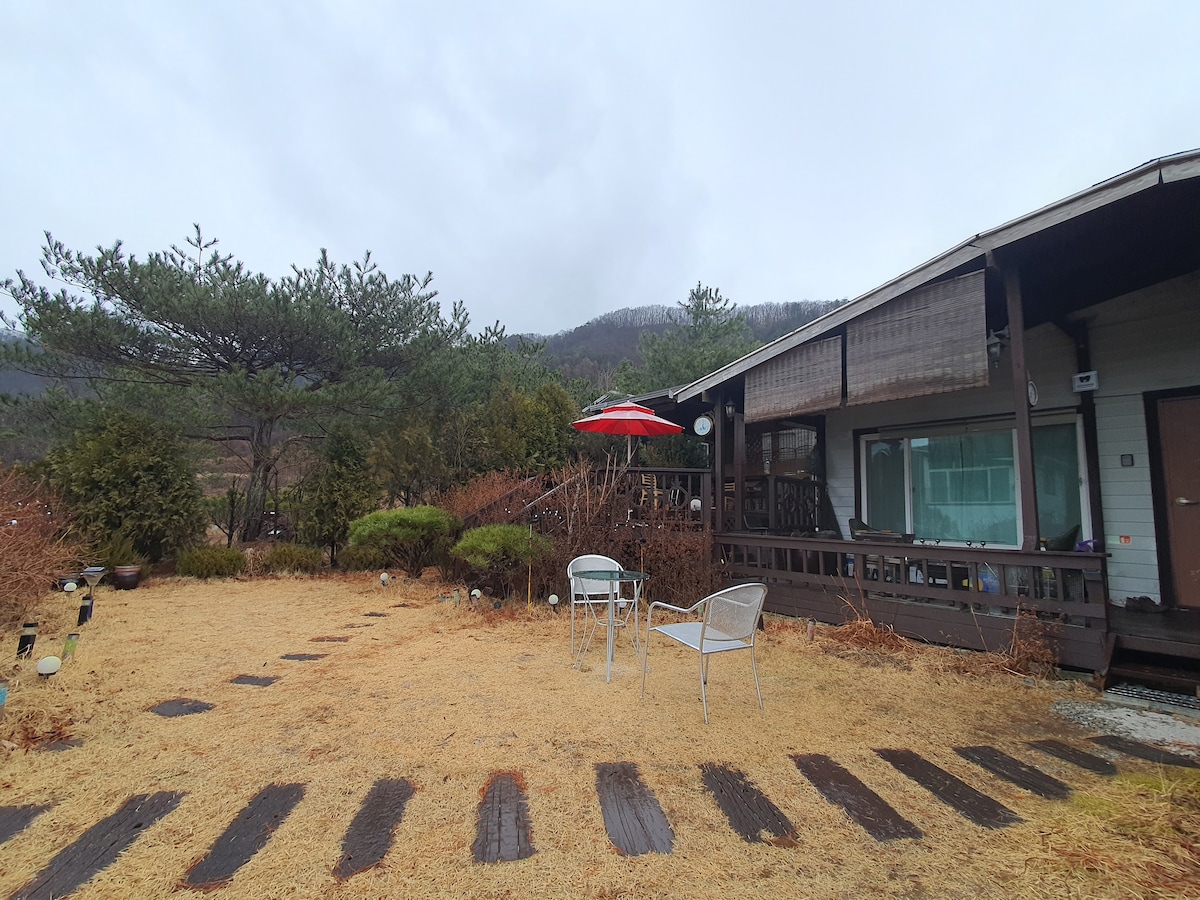 💥Fogueira 1 vez por noite💥 Esta acomodação possui um amplo quintal♡ de 150 pyeong. Todos podem se sentar no quintal e desfrutar de um churrasco e de uma grande fogueira, e você pode compartilhar suas histórias no gazebo ao ar livre. Pode ser usado por um♡ mínimo de 2 a 10 pessoas. Há uma distância♡ com outras casas e a estrutura é privada, pois o quintal não pode ser visto da estrada. O ♡interior tem 132m2 com sala de estar, cozinha, quarto e muito espaço. Em vez de olhar apenas para o número de quartos, seria bom olhar para a largura de todo o espaço. É de um andar e a cama é baixa, por isso é bom para idosos e crianças pequenas. A ♡comida pode ser entregue e é um bom lugar para ir e vir, então você pode ir de carro em 30 minutos para Hongcheon Gomgum Festival e Hwacheon Sancheoneo Festival. ♡Lotte Mart, MS Mart, Belmond Mart estão localizados a menos de 5 minutos de carro, e há uma loja de conveniência gs (Hakmuleul Branch) a menos de 10 minutos a pé. ♡Chuncheon IC 8 minutos, Gubongsan Cafe Street (Santorini) 5 minutos, Soyangdan Chicken Ribs Street 10 minutos, Legoland 15 minutos, Liquor World Department Store 7 minutos, Son Heung Min Cafe 6 minutos, Spring Valley 6 minutos, Old Day Stay 2 minutos