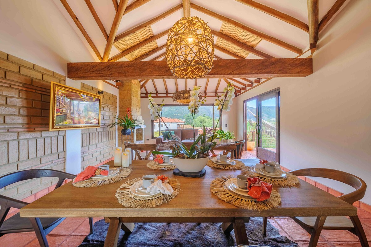 Linda Casa de Campo, dentro de uma reserva natural urbana, construída pelo meu filho Arquiteto, que se inspirou no abraço acolhedor dos nossos visitantes, perto de uma árvore Clavellino plantada pelo meu pai, daí o seu nome; vistas espetaculares da nossa impressionante e majestosa montanha do maciço da Flora Iguaque e da Fauna; verde, luz, calor, conforto, tranquilidade; belo espaço para desfrutar com a família, amigos; Excelente internet e os melhores a poucos passos da praça principal.