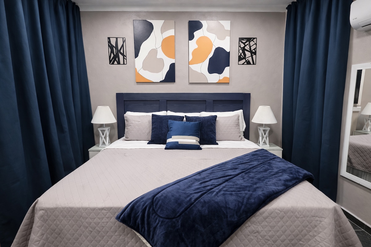 ¿Buscas seguridad y privacidad? Nosotros te la ofrecemos. Suite moderna, nueva y totalmente equipada, ideal para una estancia cómoda, privada y segura. Cuenta con cama King size, A/C silencioso, Wi-Fi rápido, Smart TV, cocina equipada y área de trabajo. Además, tiene puerta de seguridad y estacionamiento privado gratuito, totalmente bardeado, para mayor tranquilidad y resguardo de tu vehículo. Cerca del puente internacional, perfecta para viajes de trabajo o descanso.