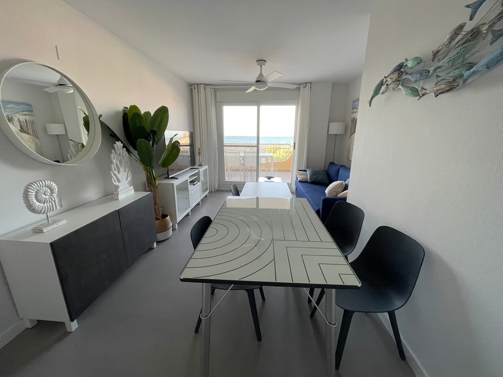 Acorde com o mar aos seus pés! Duplex de luxo na primeira linha, literalmente na areia, com vista frontal para o mar de todos os quartos e um espaçoso terraço. Ideal para 4 hóspedes, tem 2 quartos duplos, 2 banheiros, cozinha totalmente equipada, lavanderia com máquina de lavar roupa e ar condicionado em todo o ambiente. Localizado em um complexo recém-construído com acesso direto à praia, grande piscina e quadra de paddle. ✔ Primeira linha Vista para o✔ mar ✔ Piscina Acesso ✔ direto à praia