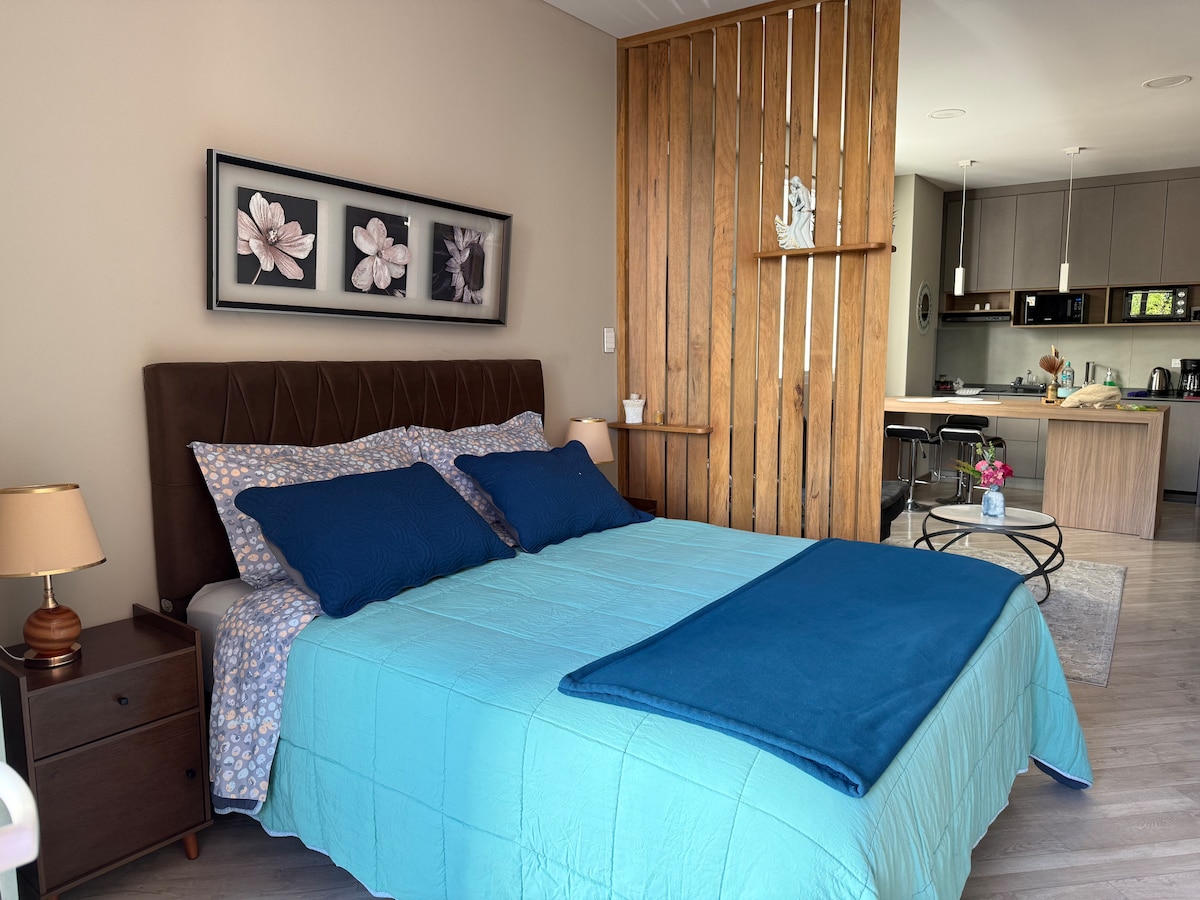 Relaxe neste espaço seguro, silencioso, confortável e despreocupado; na área superior de Cochabamba. Em frente a um belo parque para caminhadas e exercícios. Novo edifício que tem ampla sala de trabalho e Wi-Fi. Perto de cafés, Super Mercado, shoppings e restaurantes. O estúdio tem sala de estar, TV 65", WIFI, sofá-cama, cama queen size, banheiro confortável e cozinha equipada com microondas, forno elétrico, cafeteira, caldeira elétrica, geladeira e acessórios.