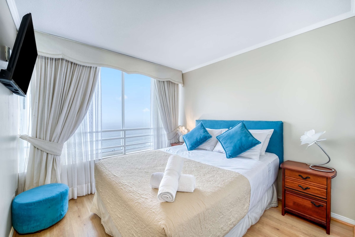 Lindo departamento con preciosa decoración. Totalmente equipado para 4 personas . Primerísima línea, vista libre, espectacular e inmejorable a Valparaíso, se encuentra a 15 min caminando de la playa Cochoa (hay que bajar una escalera). Está a pasos de Supermercado Lider y Jumbo.Incluye 1 Estacionamiento privado subterráneo. Excelente conectividad y transporte público a una cuadra. **NO ESTÁ EN EL SOCAVÓN ** DEPTO SOLO PUBLICADO EN AIRBNB No redes sociales ni otras plataformas.
