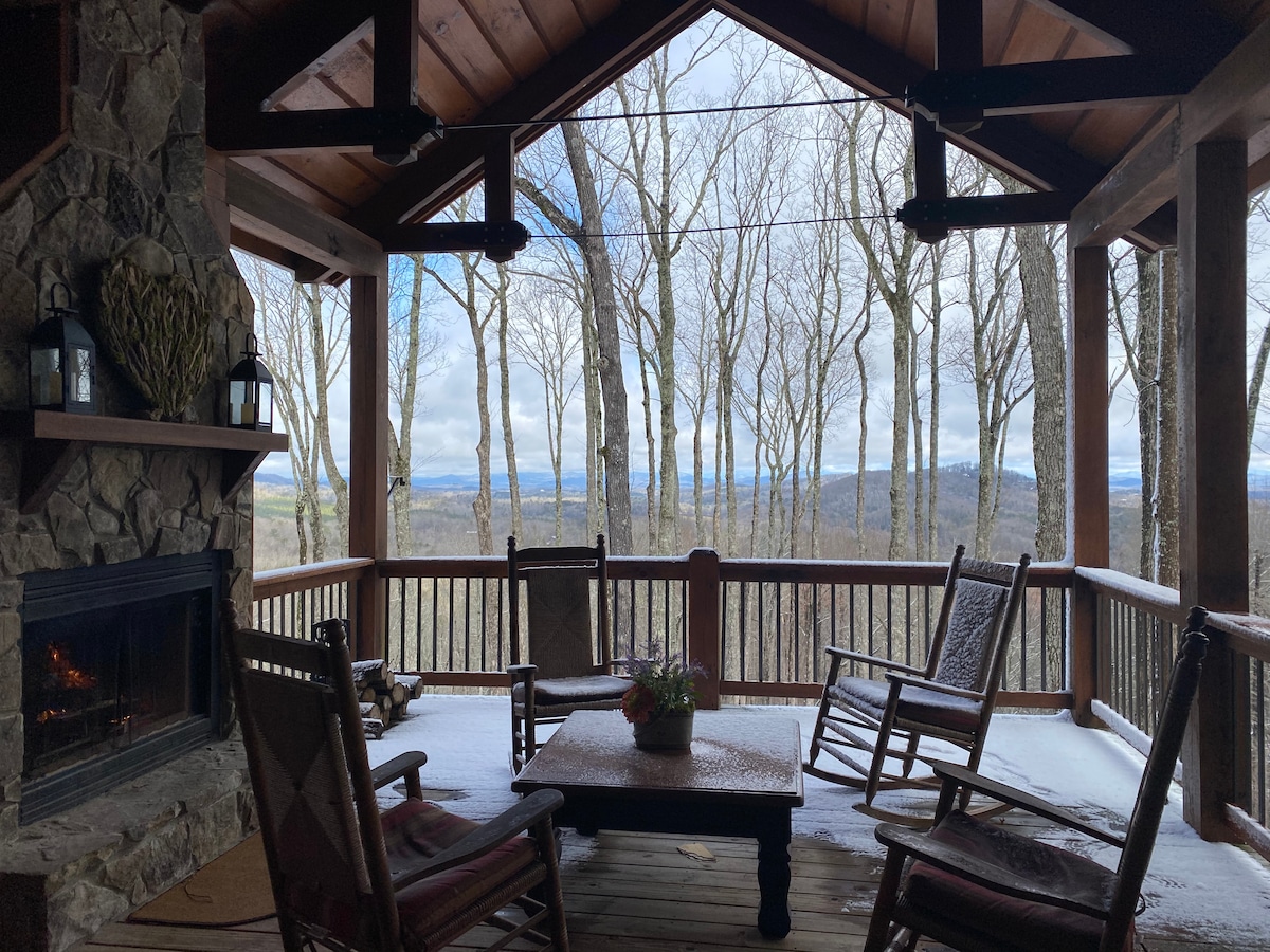 Se você está procurando o fator uau! Esta não é a sua cabana comum. Esta é uma bela cabana de luxo. Quase 1400 pés quadrados, o que é muito grande para um de dois quartos. Tem um grande deck coberto do lado de fora com uma lareira externa e banheira de hidromassagem. Também muitos lugares para sentar e área de refeições no deck externo. Cozinha linda. Dois banheiros. Sala de estar elegante na montanha e móveis de cabana de madeira de luxo. Longa entrada até a cabana. Muito privado com vista deslumbrante das montanhas