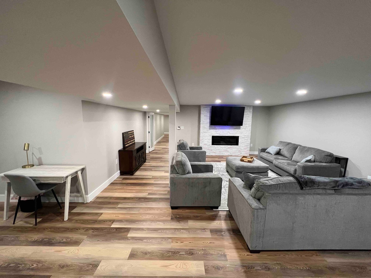 Para alugar é uma suíte nova e totalmente mobiliada no porão com uma entrada privada, 2 quartos, banheiro, cozinha completa, TV inteligente de 55" montada na parede, Wi-Fi. Esta propriedade está a uma curta distância a pé do Beaver Stadium ou do Bryce Jordan Center via University Drive (aproximadamente 1,1 milhas). Nosso grupo ideal varia. Pode ser 2 casais (jovens ou velhos), pais com filhos ou apenas alguns amigos. O apartamento acomoda confortavelmente 6 pessoas. Localizado no bairro de State College. UMA VOLTA para chegar ao estádio!!!