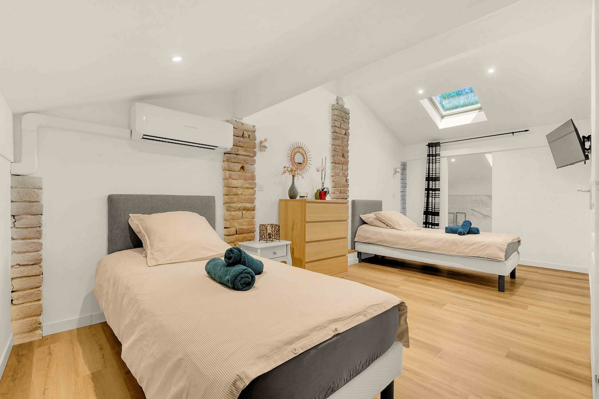 Belo quarto de 25 m² em uma bela Toulouse, perto do Eurocentre, do Canal du Midi e da estação ferroviária. Estacionamento gratuito disponível. O aluguel inclui: * Uma cama de casal real 160 X 200 com colchão muito bom * Duas camas individuais * Banheiro privado * Lençóis e toalhas limpas para cada hóspede * Gel de banho/xampu * Acesso à piscina (das 8h às 21h, de junho a setembro) * TV * Wi-Fi * Uma máquina de lavar e secar roupa (opções pagas)