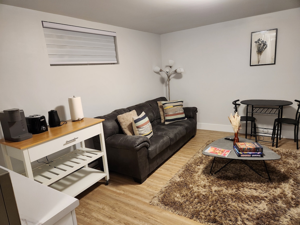 Estamos felizes em hospedá-lo em nossa nova casa estrategicamente localizada em um ambiente tranquilo em Riverview. Nosso luxuoso porão com sua própria entrada privativa e ampla luz natural é um lar longe de casa, bem equipado para tornar sua estadia confortável. Desfrute da tranquilidade de um ambiente de cenário, garantindo privacidade e paz. Este espaço oferece uma cozinha contemporânea, um sofá confortável, um quarto luxuosamente confortável, um banheiro privativo e a conveniência de uma lavanderia na unidade.