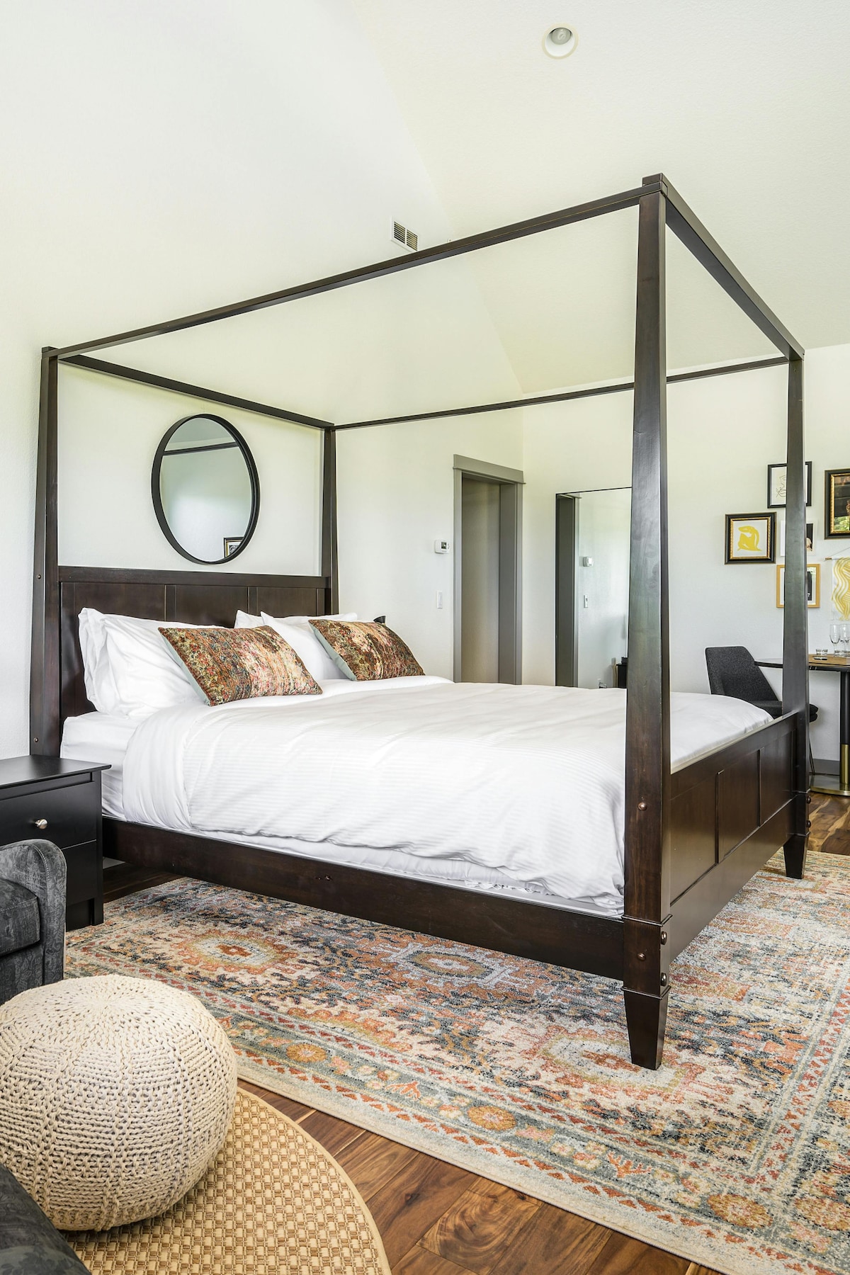 Esta suíte King é perfeita para uma viagem em família ou um grupo de amigos com camas extras e amplo espaço. Além da cama king, há um conjunto de beliches de tamanho duplo feitos sob medida. Você vai adorar a luz natural, o espaço amplo e todas as comodidades padrão, incluindo um banheiro privativo com chuveiro e uma cozinha compacta. O Inn of the White Salmon é tranquilo, impecável e centralmente localizado para todas as atrações do desfiladeiro. Você também terá acesso aos jardins compartilhados e à sala comum.