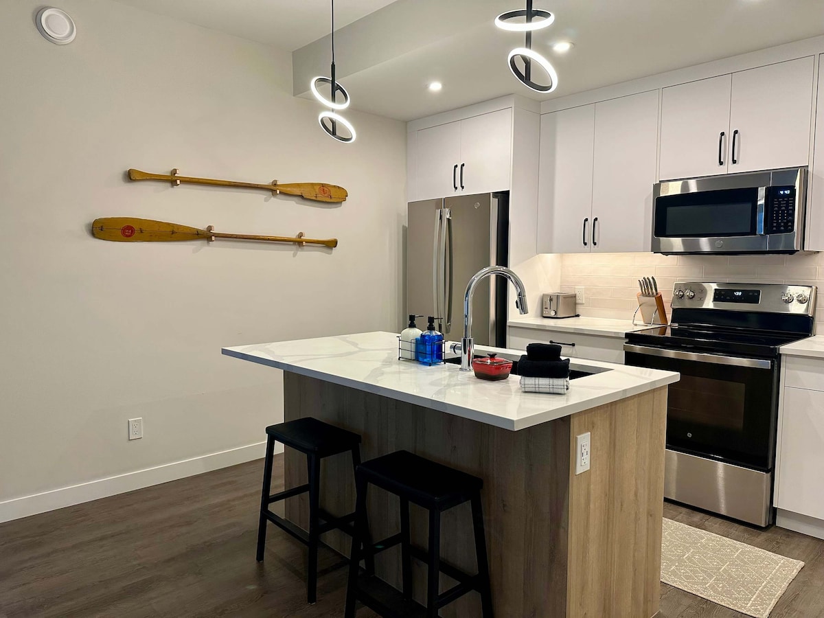 Este novo condomínio de dois quartos é inundado com luz natural, tem excelentes vistas para a montanha e tem vista para o rio. Planta aberta contemporânea, um lugar artístico e aconchegante que acomoda até 4 pessoas e é ideal para casais ou uma família. Com localização central no centro da cidade, você está a poucos passos de seus cafés, lojas e restaurantes favoritos. Você está a poucos minutos da colina de esqui e das trilhas de bicicleta Moonraker/CBT, e bem no caminho do rio. Registro provincial nº H391623453
