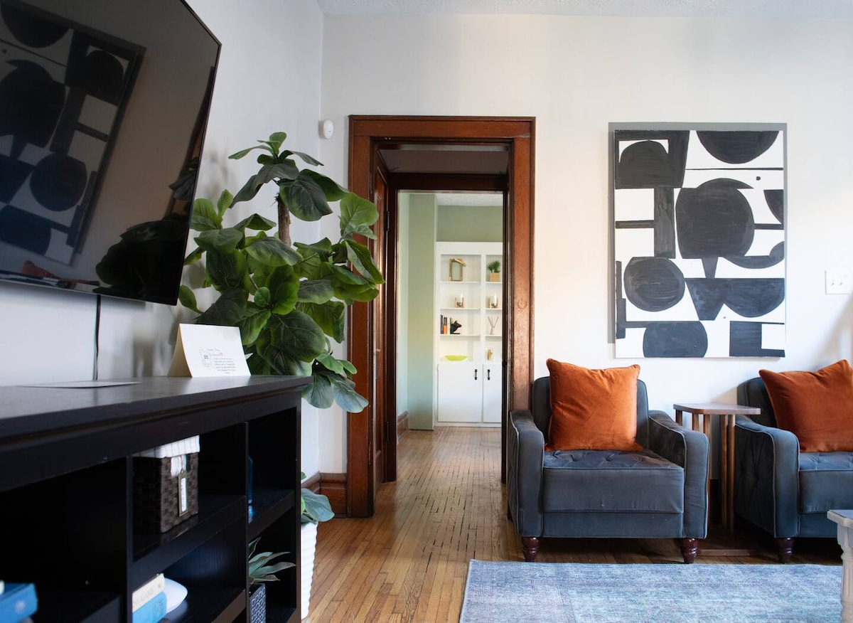 Relaxe neste elegante duplex de 3 quartos e 1 banheiro na histórica Clintonville. Cada quarto dispõe de uma cama king size, roupas de cama de luxo, cortinas blackout, pisos de madeira, um ventilador de teto e TV smart de 42 polegadas. O banheiro recém-renovado tem um chuveiro. Seu azulejo de aparência histórica mantém o charme da época. Cozinha totalmente equipada inclui um cooktop a gás, máquina de lavar louça, micro-ondas, água filtrada, Keurig e estação de trabalho aconchegante. Sala de jantar espaçosa e sala de estar oferecem decoração única, luz natural e um lugar calmo para relaxar.