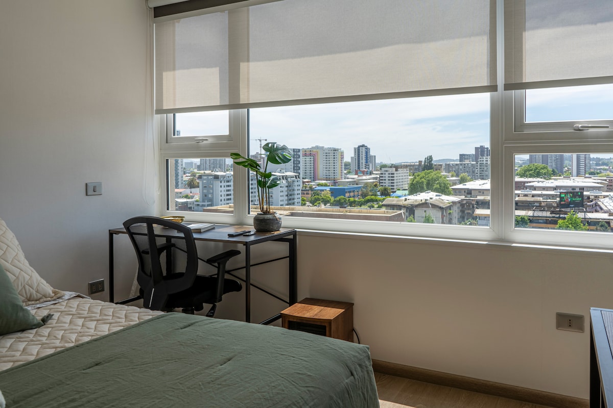Excelente apartamento com bela vista para a lagoa Tres Pascualas, em frente à Universidade de San Sebastián e a poucos passos do centro de Concepción. Totalmente equipado com cama de casal, Smart TV, Wi-Fi, escrivaninha e sofá-cama na sala de estar, podendo acomodar até 3 pessoas. Cozinha americana com forno, bicos, louça, utensílios de cozinha, chaleira. Banheiro com todos os equipamentos embutidos (toalhas, sabonete, xampu).