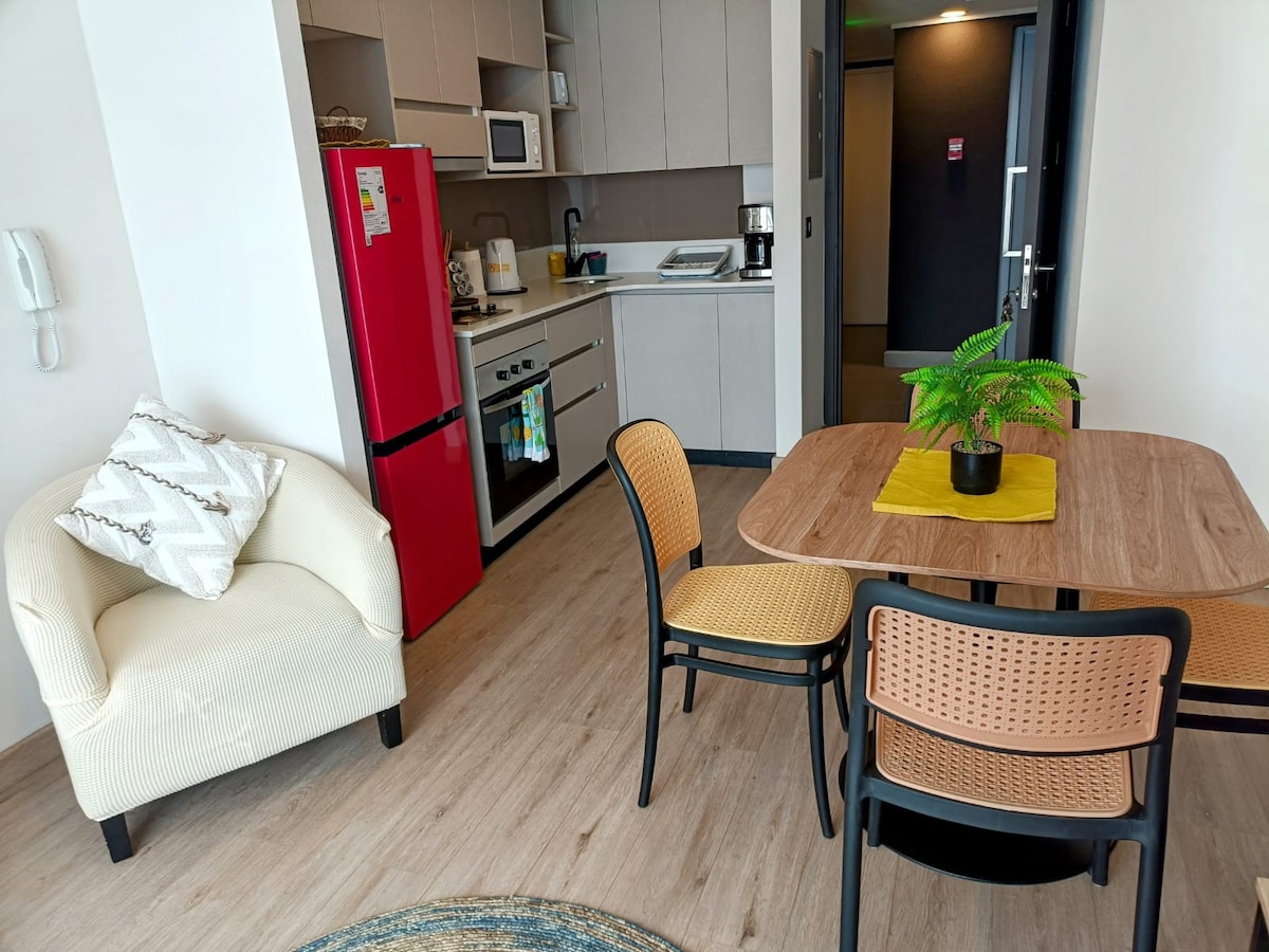 Desfrute de uma experiência elegante nesta acomodação central, confortável e totalmente equipada: - Ideal para 2 pessoas - 1 cama queen size + 1 futon - Wi-Fi, SmartTV+3000 canais (futebol incluído) Netflix - Cozinha totalmente equipada. O prédio oferece academia e sala de coworking. 3 minutos do terminal, estádio, universidades, lavanderia, farmácias e supermercados. Com locomoción na porta, conectividade ideal. Concierge 24h. Perfeito para relaxar, trabalhar ou explorar a cidade.