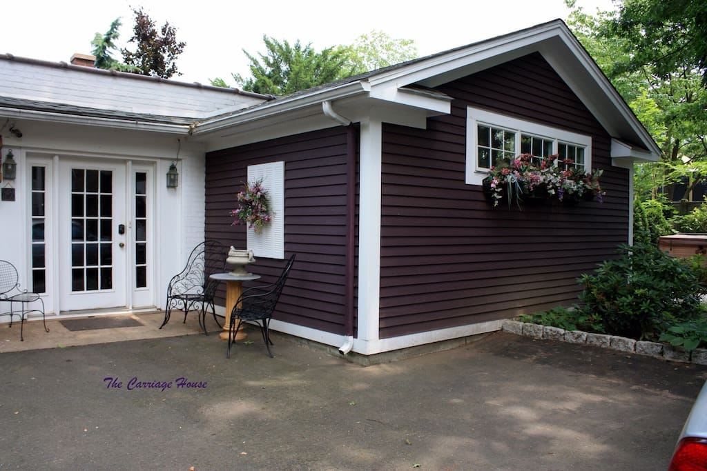 There are 2 seperate suites for rent. These are not connected but both open up to a large, private terrace surrounded by gardens. Relax and enjoy the charms of downtown Mystic. Located on the historic property of Captain William Morgan, an 18th century sea captain, this private Carriage House is situated just a 1/4 block from downtown, in the heart of Mystic, but also quiet & secluded. The larger suite sleeps 3 with a king bed and smaller full size futon. The smaller suite has a king bed.