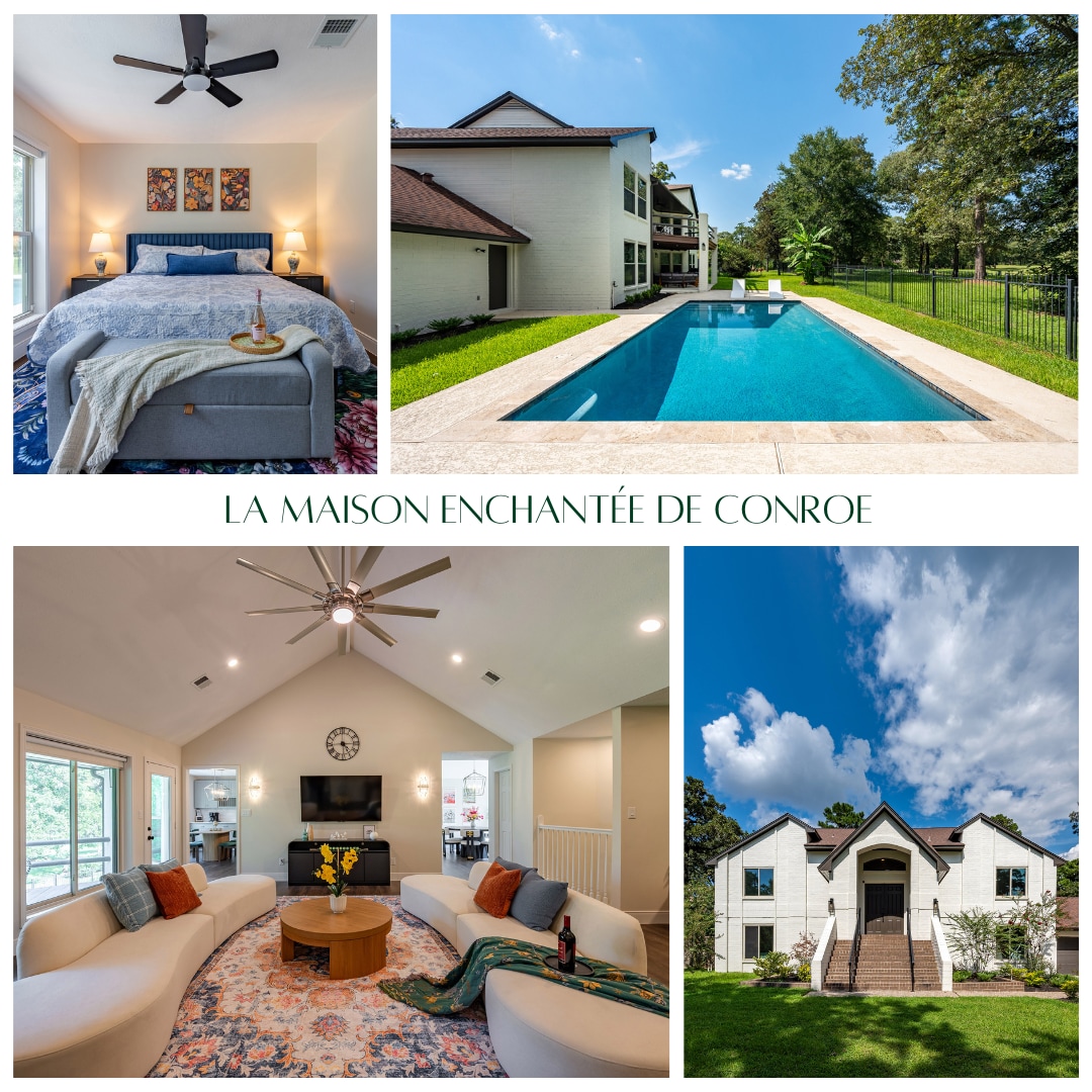 Relaxe nesta casa nova, moderna e elegante. Localizado no coração do centro de Conroe. Extremamente perto de ótimos restaurantes, entretenimento e do centro de convenções Conroe. A cerca de 15 minutos do Lago Conroe, estas férias serão inesquecíveis! Desfrute de um filme no terraço sob as estrelas ou crie memórias ao redor da lareira ao ar livre no quintal. Aconchegue-se em frente à televisão de 75 polegadas. Com televisões em todos os quartos, desfrute de uma noite de descanso tranquila em camas confortáveis.