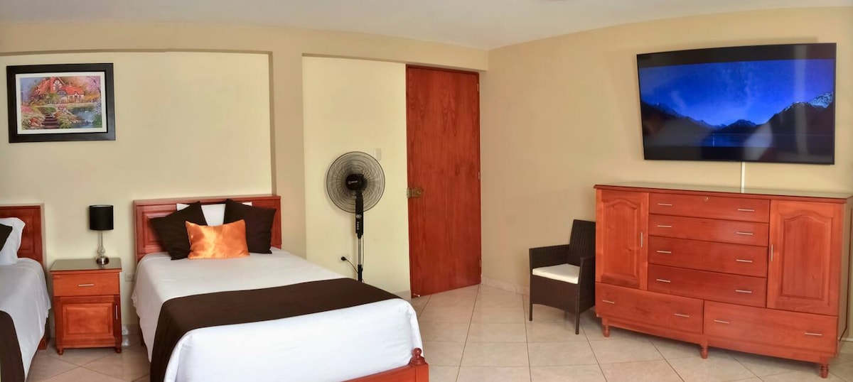 Quartos projetados para hóspedes do Airbnb, como viajantes, turistas, empresários e profissionais. - O apartamento está totalmente equipado. Você pode cozinhar, conectar-se ao WIFI, usar água quente e assistir a séries ou filmes da Netflix em uma Smart TV de 50 polegadas - Serviço de limpeza incluído. - Edifício moderno e privado. Também temos câmeras de segurança - Estamos perto de lojas, bancos Tottus, Bcp, Interbank, farmácias continentais, restaurantes, ônibus e a 5 minutos do aeroporto.