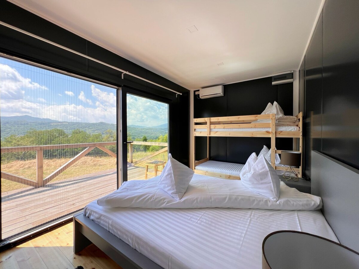 Acomodação para 2 adultos e 2 crianças: apenas café da manhã Oferecemos acomodação em bangalôs tipo contêiner com banheiros próprios, para a família (2 adultos e 2 crianças). Dentro do nosso Glamping você pode desfrutar da piscina ao ar livre, quadra de vôlei de areia ou pumptrack! No centro do Glamping está o Restaurante aberto diariamente apenas para o café da manhã. O preço do alojamento inclui jantar e café da manhã para 2 adultos e 2 crianças.