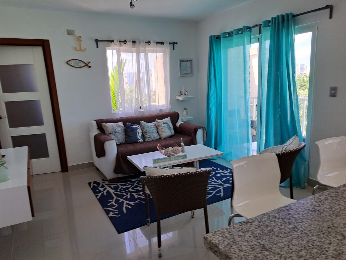 Apartamento acolhedor para 4 hóspedes localizado muito perto das belas praias de Bávaro, Punta Cana, equipado com tudo o que você precisa para uma estadia agradável, tem piscina, áreas comuns, jardim, cozinha totalmente equipada, estacionamento, quartos confortáveis, banheiro no quarto principal e banheiro de hóspedes, TV de 42 ", Wi-Fi gratuito, TV a cabo, geladeira, fogão, micro-ondas, cafeteira, máquina de lavar roupa e produtos de higiene pessoal e cozinha.